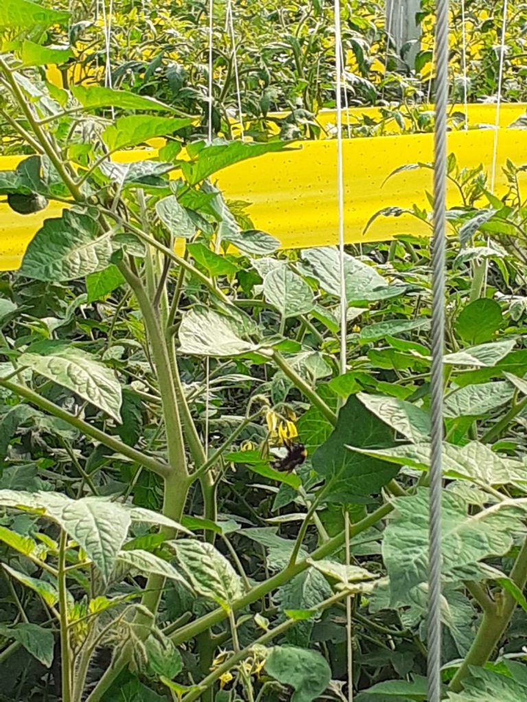W szklarni pracują nie tylko ludzie- na fotografii trzmiel zapylający kwiaty